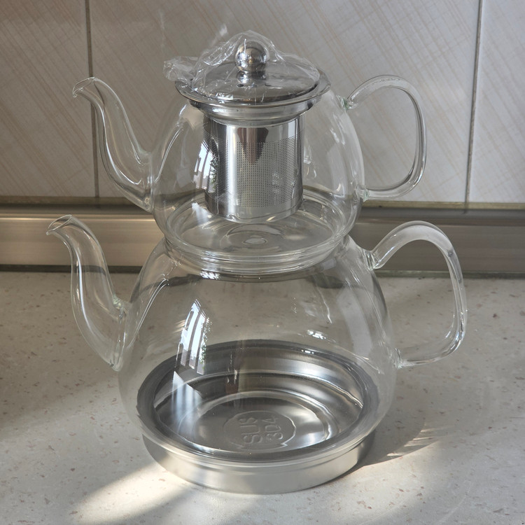 خرید کتری و قوری پیرکس کف استیل با قابلیت استفاده مستقیم روی شعله. دارای فیلتر تفالهگیر استیل، بدنه آنتیشوک و طراحی مدرن. بهترین انتخاب برای دم کردن چای و دمنوش با حفظ عطر و طعم اصلی.