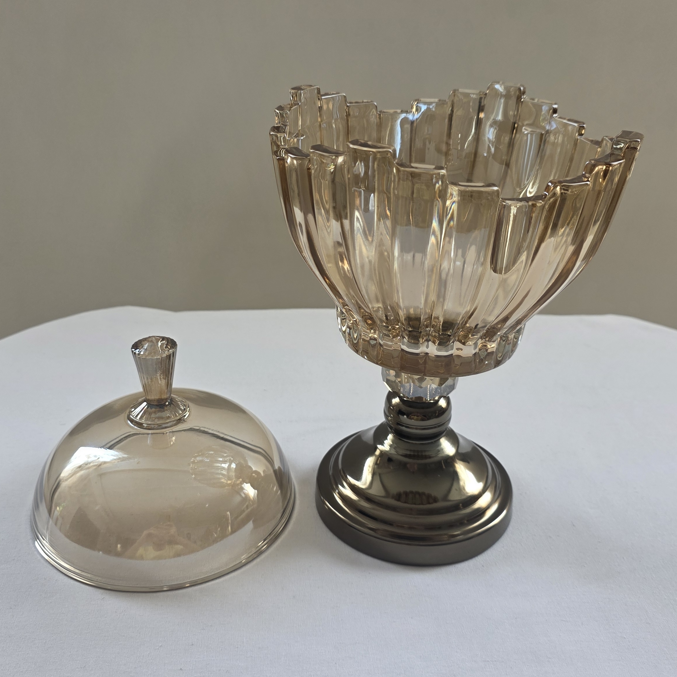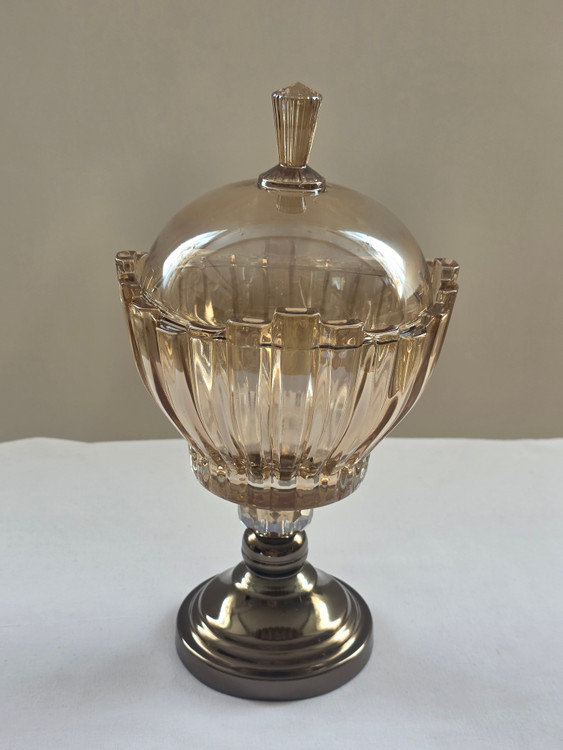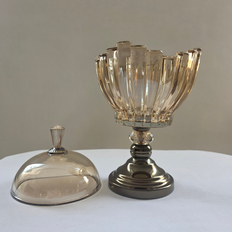 شکلاتخوری دربدار مدل برلین با بدنه کریستال شامپاینی/شفاف و پایه فلزی رنگ ثابت. انتخابی مجلل برای میز پذیرایی و جهیزیه. حفظ تازگی شکلات با درب اختصاصی