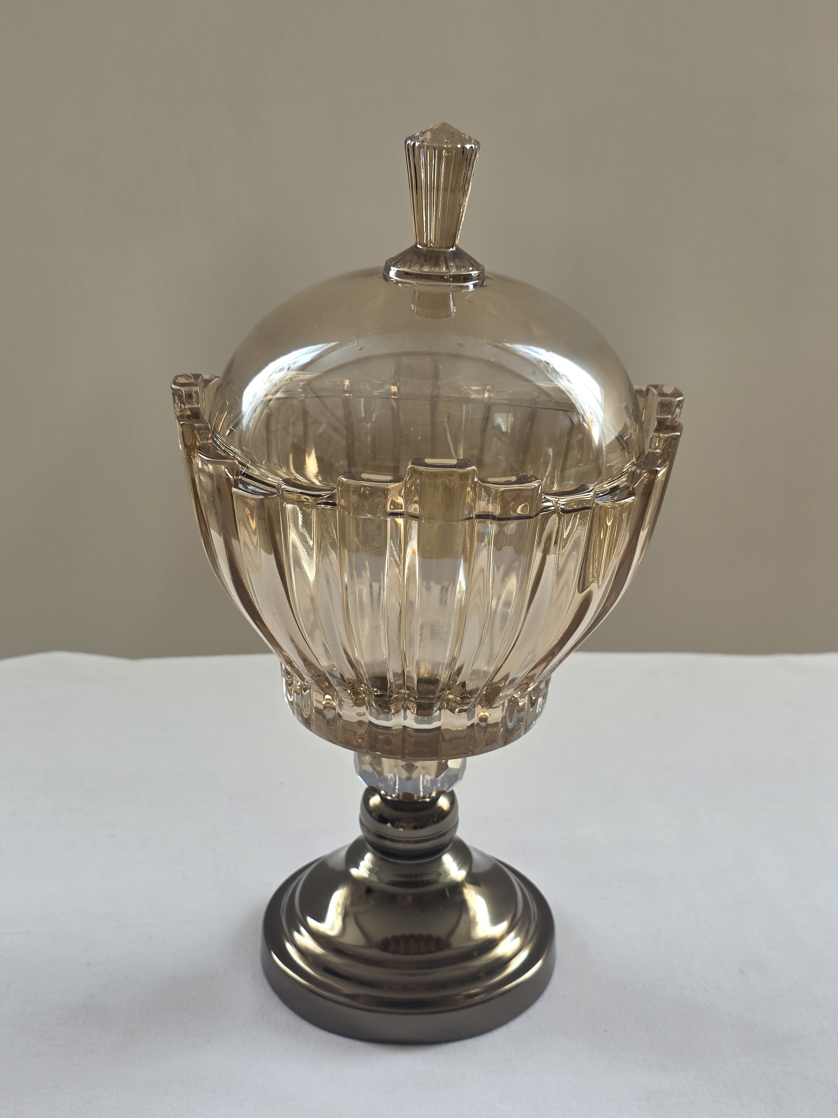 • پایه فلزی سنگین و بااصالت: پایه این محصول با رنگ دودی/آنتیک، تضاد زیبایی با شفافیت کریستال ایجاد کرده و به دلیل وزن مناسب، پایداری ظرف را روی سطوح صیقلی تضمین میکند.